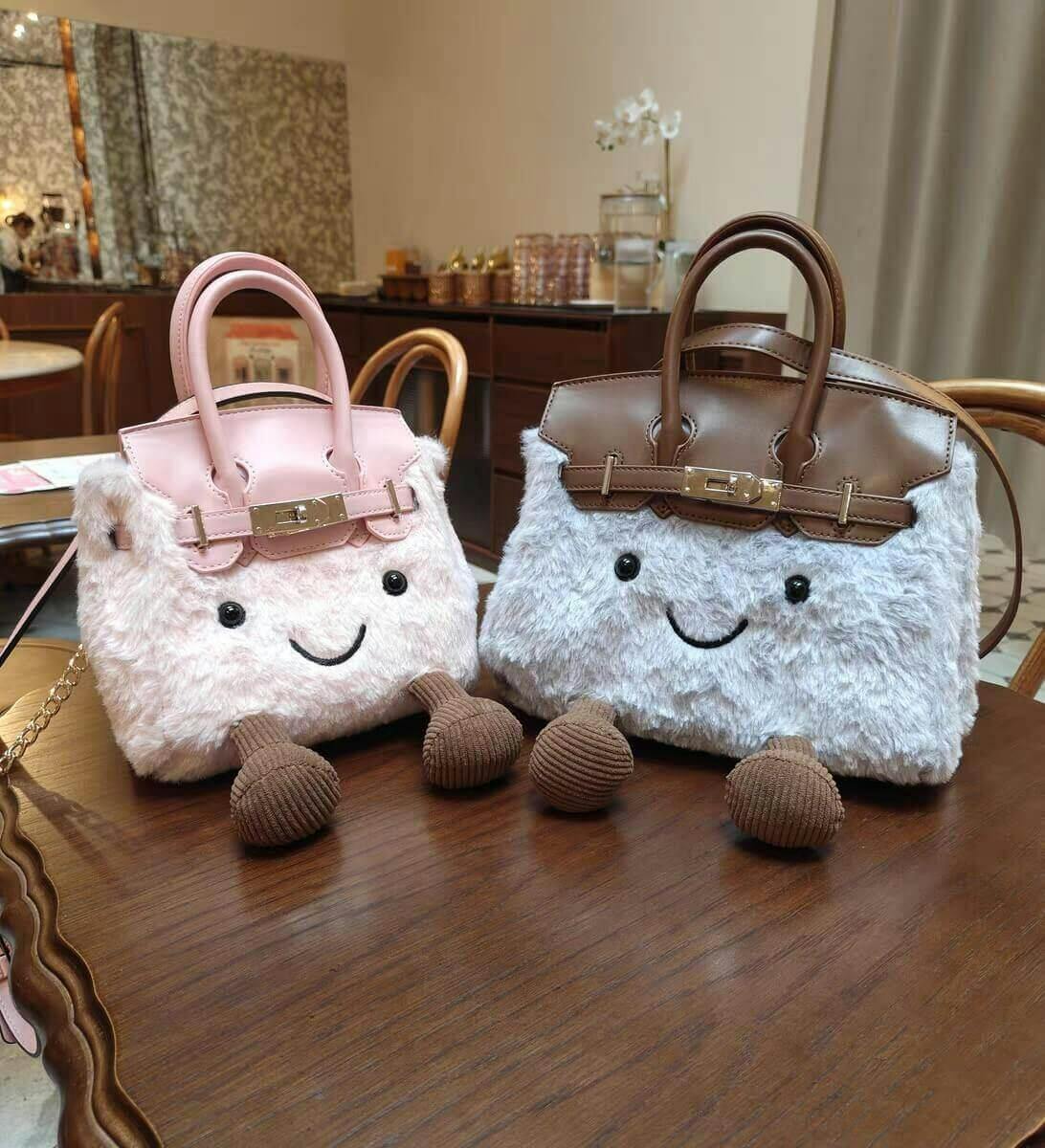 Each piece starts with a high-quality base bag, then hand-sewn with fluffy fabric and finished with detailed accents — eyes, mouth, and little feet. Every bag takes 3 days to complete.